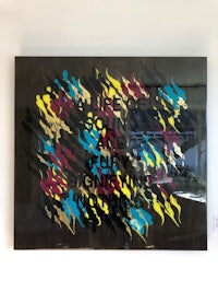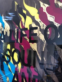 ‘A Life of Sound and Fury Signifying Nothing’ is the text upon a stained birch plywood board, with acid yellow, burgundy, electric blue and gold leaf accenting the piece from beneath. Heavy use of black shapes camouflage the text which can be slowly extrapolated. Coated in clear glossy resin.
