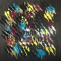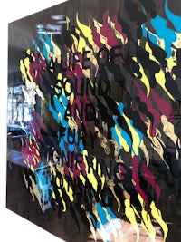 The viewer must take a moment to decipher the piece by dancing with its shimmering surface, allowing the legibility and resonance of the words to be revealed slowly.
